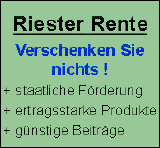 Die Riester-Rente ist eine Variante der privaten Altersvorsorge, die ideal für Familien mit geringem Einkommen ist – denn der Staat zahlt Zulagen. Ab 2006 sind das 114 Euro für jeden versicherten Ehepartner und 138 Euro pro Kind im Jahr. Eine vierköpfige Familie bekommt also bis zu 504 Euro geschenkt und wird damit unter Umständen sogar von eigenen Beiträgen befreit. Zwar muss bei der Riester-Rente ein Mindestanteil des Einkommens investiert werden, 2006 liegt der bei 3 Prozent. Fallen die staatlichen Zulagen so hoch aus, dass sie 3 Prozent des Einkommens übersteigen, braucht der Riester-Versicherte nur einen Mindestbeitrag in Höhe von 60 Euro pro Jahr selbst zu investieren. Wer wenig verdient, lässt daher den Staat den Löwenanteil zur privaten Rente zahlen und sichert sich so kostengünstig ein zusätzliches Polster für die Zeit nach dem Renteneintritt.