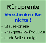 Im Gegensatz zur gesetzlichen Rentenversicherung werden bei der Basisrente Ihre Beiträge für Sie persönlich angespart und nicht in die allgemeine Rentenkasse geleitet. Sie erhalten Ihre Ersparnisse also auf jeden Fall mit Eintritt ins Rentenalter - und profitieren während der Sparphase zusätzlich von Steuervorteilen. |